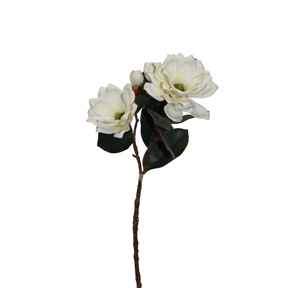 Magnolia artificial con petalos de borde crema, ideal para agregar un toque suave y natural a cualquier espacio, manteniendo un estilo clasico y refinado.