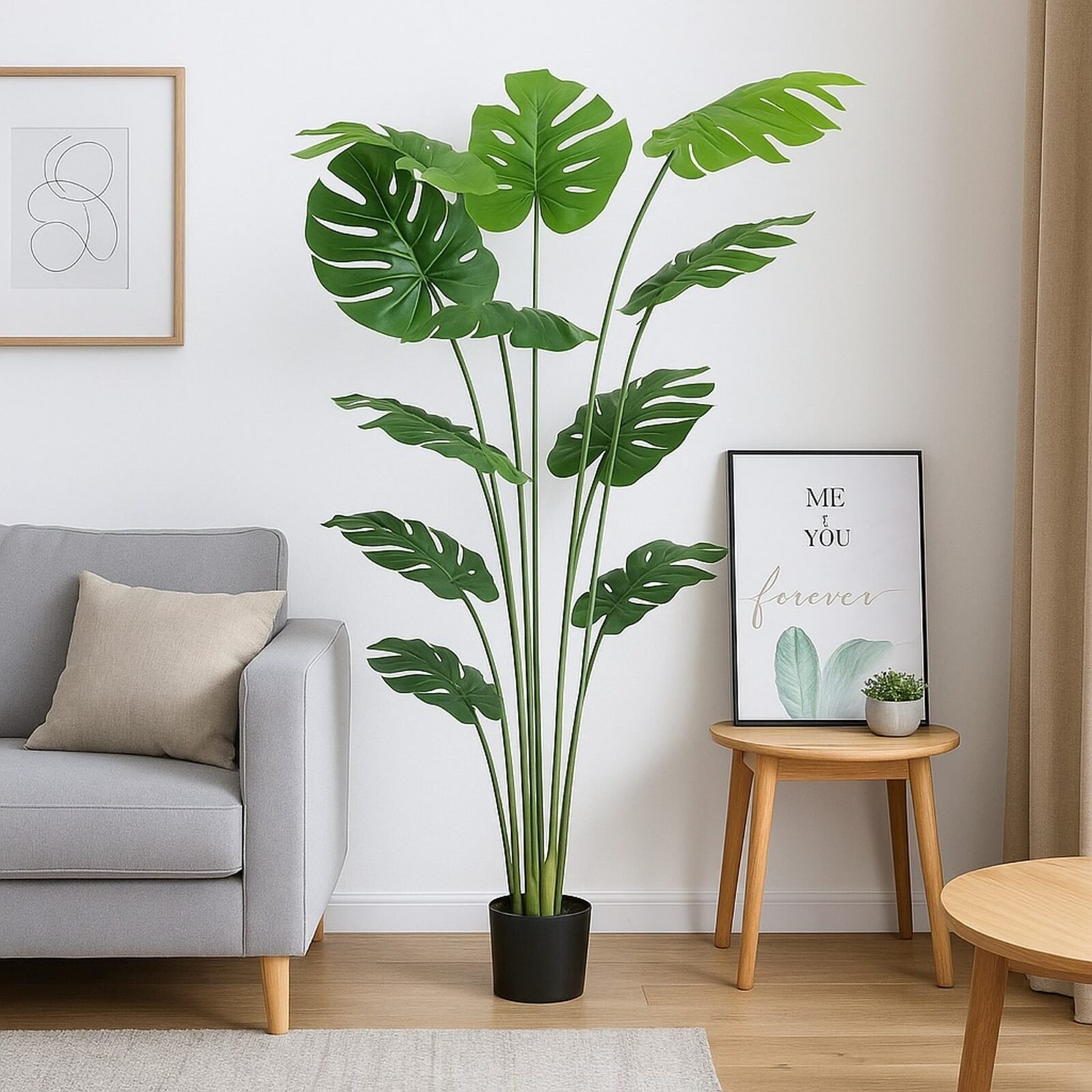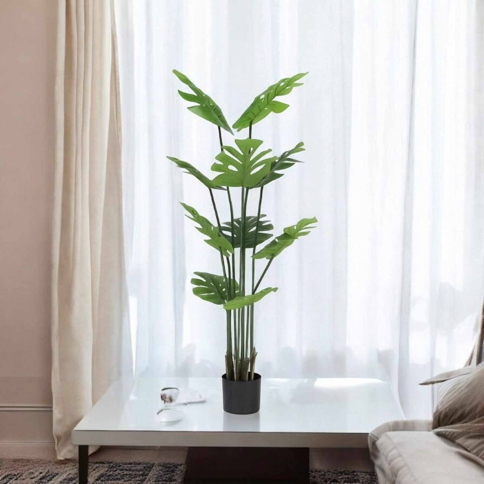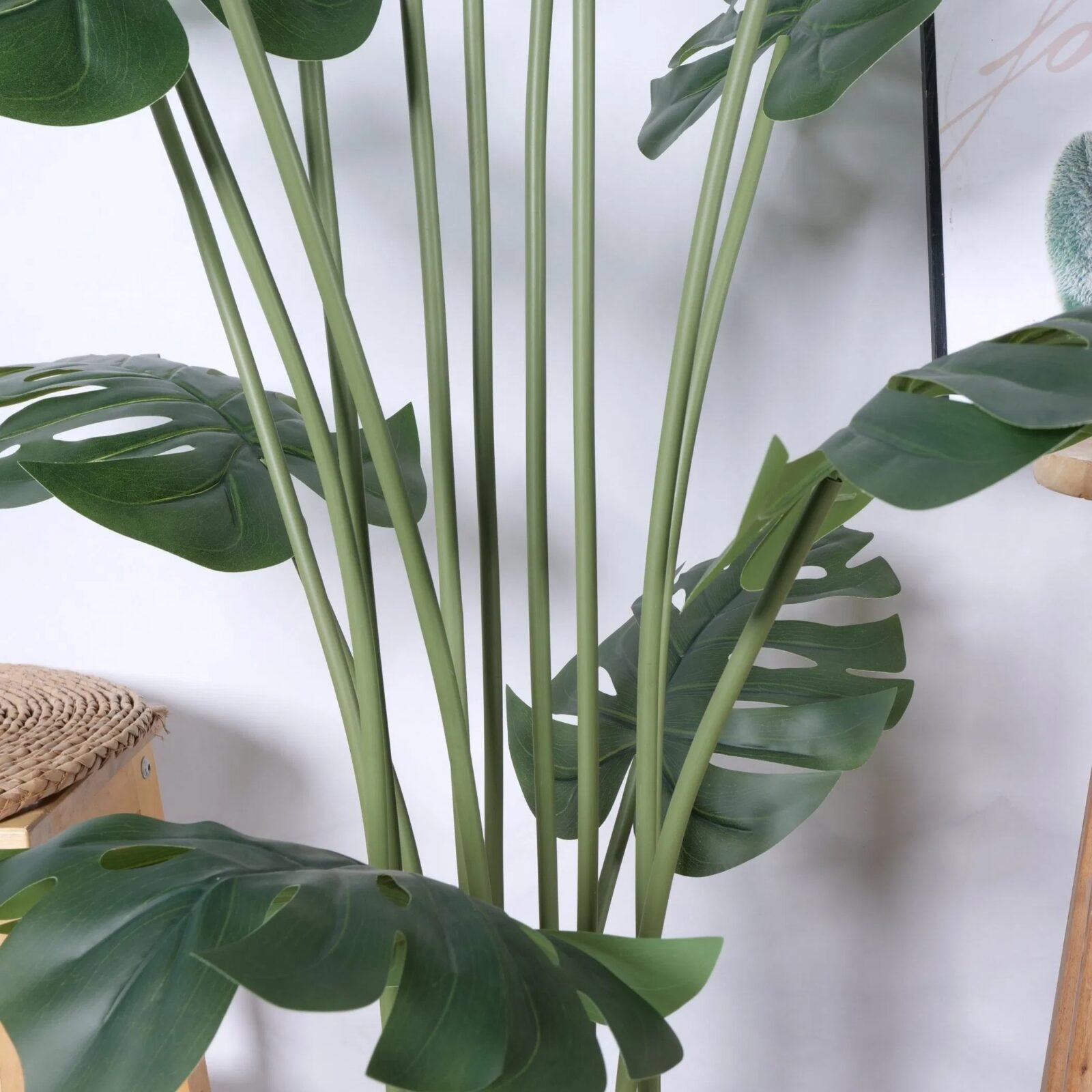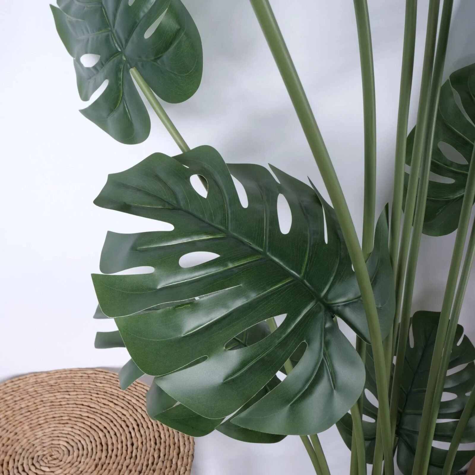 La Mata Costilla de Adán artificial de 150 cm destaca por sus 10 grandes y detalladas hojas, que replican de forma realista la belleza exótica de la planta Monstera. Su tamaño y diseño imponente la convierten en un punto focal ideal para cualquier espacio, aportando un toque de frescura tropical y sofisticación. Perfecta para interiores o exteriores cubiertos, esta planta no requiere cuidados ni mantenimiento, manteniéndose siempre verde y vibrante para darle vida y elegancia a tu decoración.