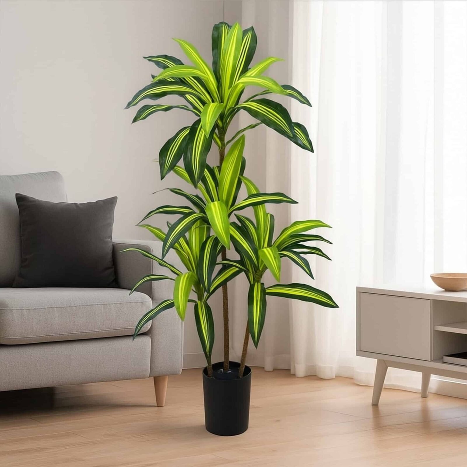 La Mata de la Felicidad artificial de 120 cm, con 4 troncos robustos, es una excelente opción para aportar armonía y frescura a cualquier ambiente. Su frondoso follaje verde y su diseño realista añaden un toque natural y elegante, ideal para interiores o exteriores protegidos. Perfecta para quienes desean disfrutar de una decoración verde sin necesidad de cuidados, esta planta se mantendrá siempre vibrante y en óptimas condiciones, proporcionando un ambiente relajante y acogedor.