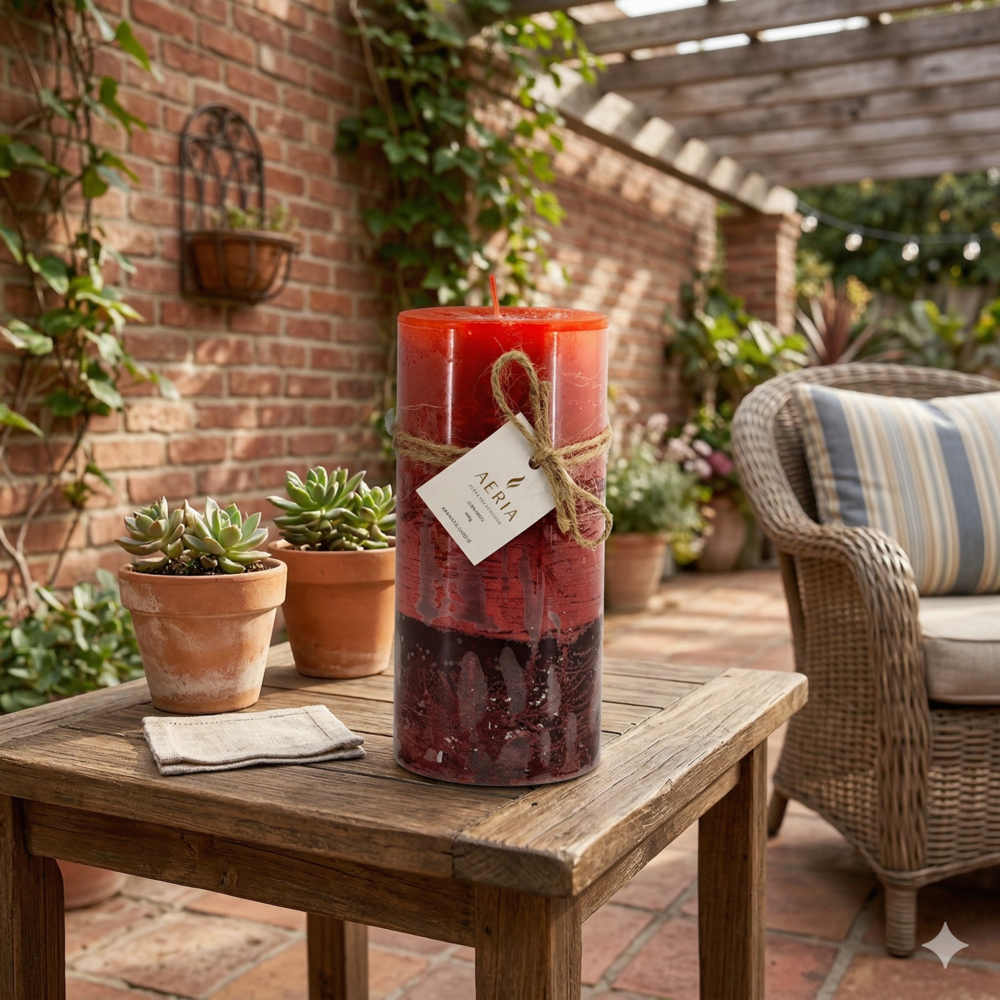 Esta pieza destaca por su espectacular diseño tricolor en degradado, presentando tres capas de cera que transitan armoniosamente desde un rojo carmesí intenso en la base hasta un tono coral suave y cálido en la cima. A diferencia de la línea rústica, su acabado es liso y pulido, lo que resalta la nitidez de la transición cromática y le otorga una estética contemporánea, limpia y escultural. Con su imponente altura, es un objeto de diseño que aporta verticalidad, pasión y una fuerza visual inigualable a su decoración.