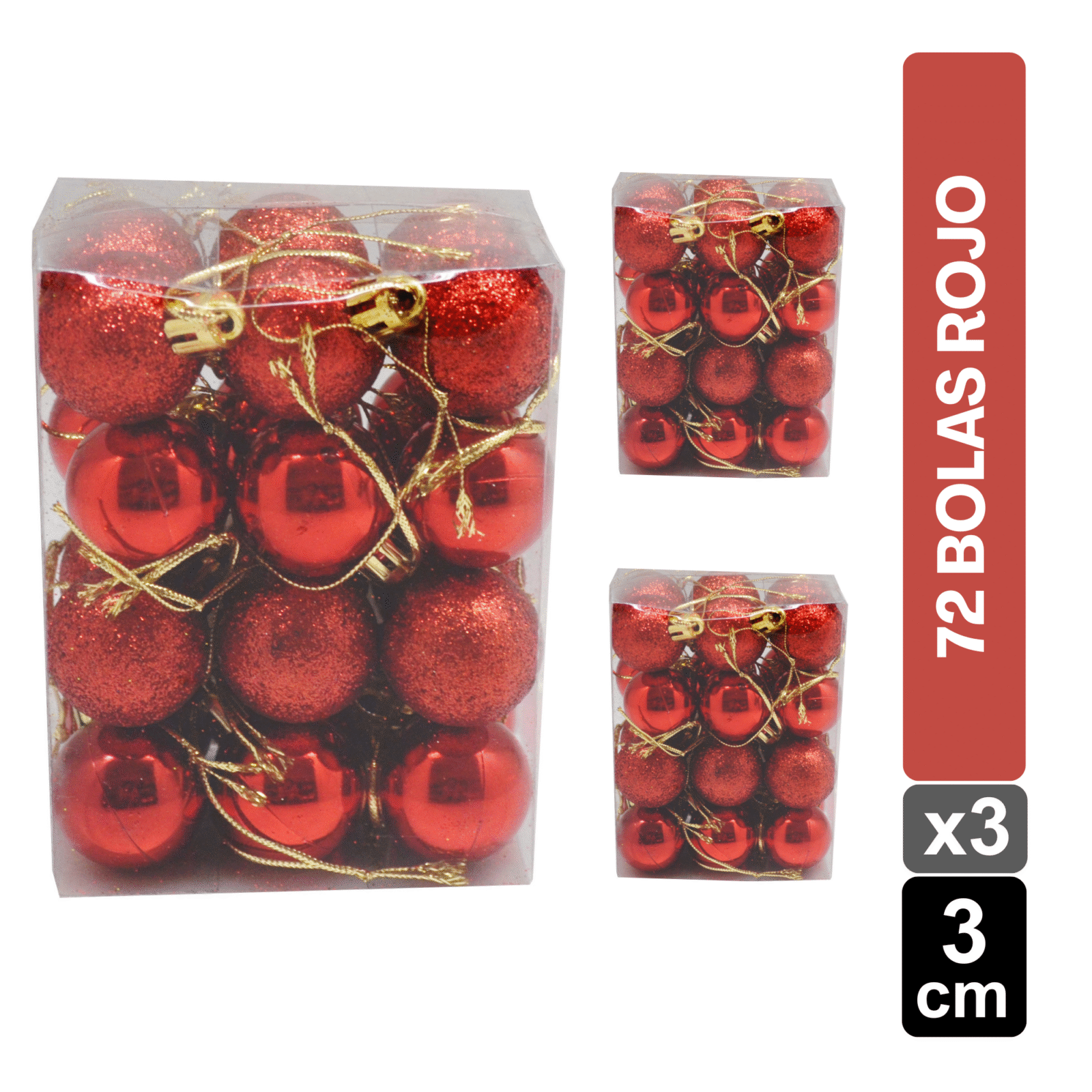Aporta brillo y estilo a tu hogar con este Set de 72 bolas navideñas rojo de 3 CM. Con un acabado brillante y escarchado (BRI-ESC), estas esferas son perfectas para la decoración del árbol de Navidad, guirnaldas o centros de mesa. Su tonalidad rojo combina fácilmente con adornos dorados, plateados, rojos o champaña, creando un ambiente festivo y elegante.