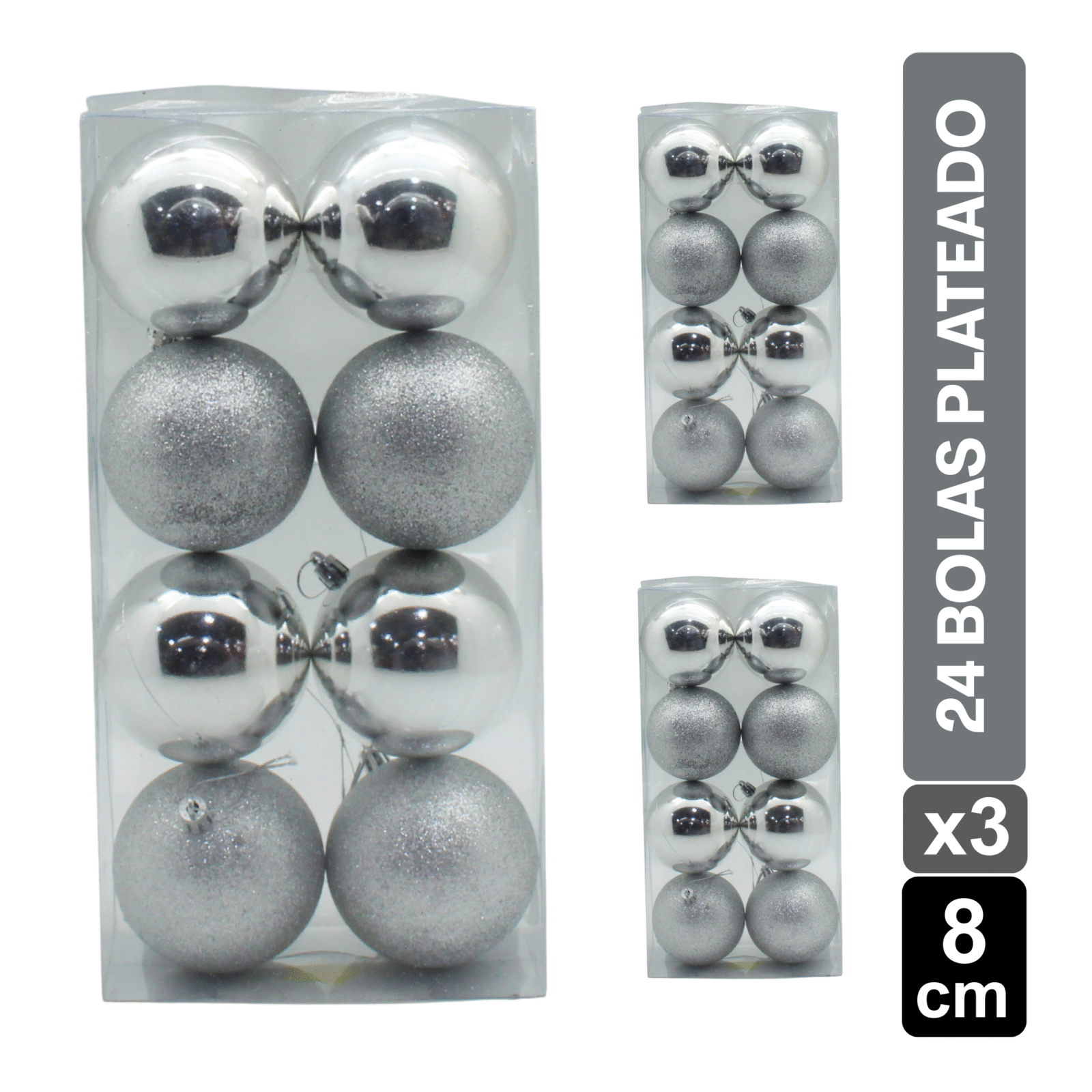 Aporta brillo y estilo a tu hogar con este Set de 24 bolas navideñas plateado de 8 CM. Con un acabado brillante y escarchado (BRI-ESC), estas esferas son perfectas para la decoración del árbol de Navidad, guirnaldas o centros de mesa. Su tonalidad plateado combina fácilmente con adornos dorados, plateados, rojos o champaña, creando un ambiente festivo y elegante.